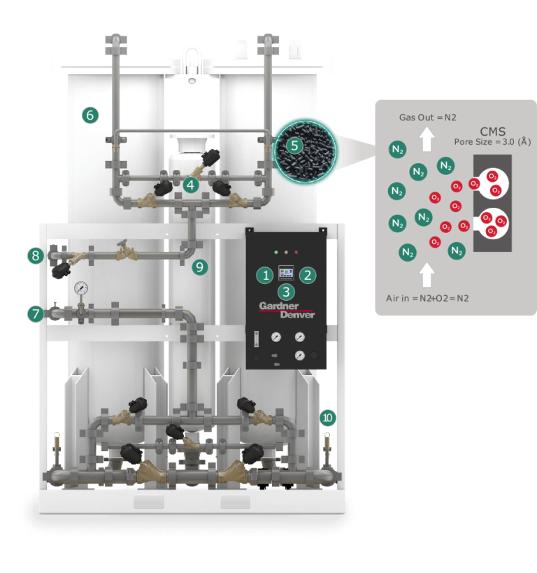 Alimentado pela tecnologia PSA (Pressure Swing Adsorption) da Gardner Denver, o sistema XGN2 elimina a necessidade de transporte e armazenamento tradicionais de nitrogênio.